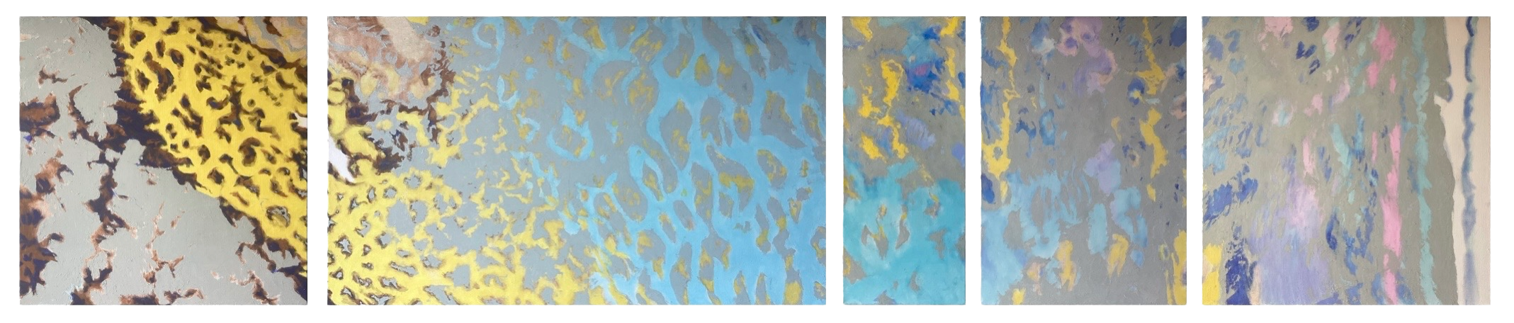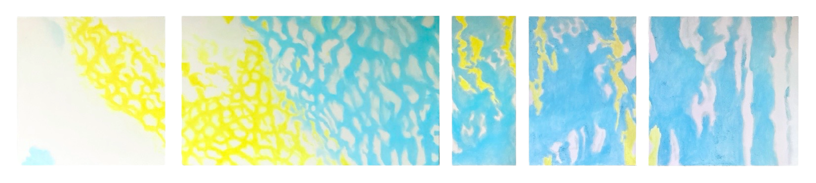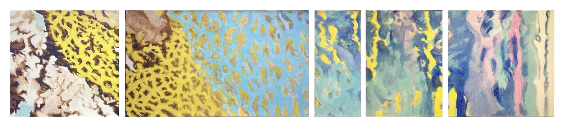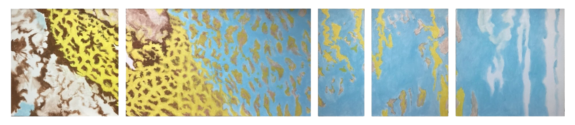 peints parfois en plusieurs mois sur la toile découpée, tendue, encollée et blanchie à la main par application de pigments broyés à l’huile, constituent chacun un ensemble de trois à six tableaux d’une hauteur fixe de septante centimètres et d’une largeur variant de 30 à 120 centimètres.